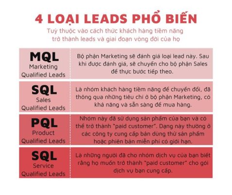 Trong Lead Generation có 4 loại leads phổ biến tùy thuộc vào cách thức khác hàng tiềm năng trở thành leads và giai đoạn vòng đời của họ.
