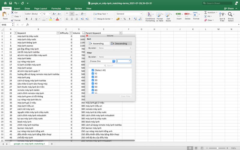 Sau khi thu thập danh sách từ khóa, bạn cần lọc nó dựa trên độ khó (KD) và số lượng từ (word count). Điều này giúp bạn xác định các từ khóa phù hợp. Sau khi lọc xong, hãy xuất file để dễ quản lý.